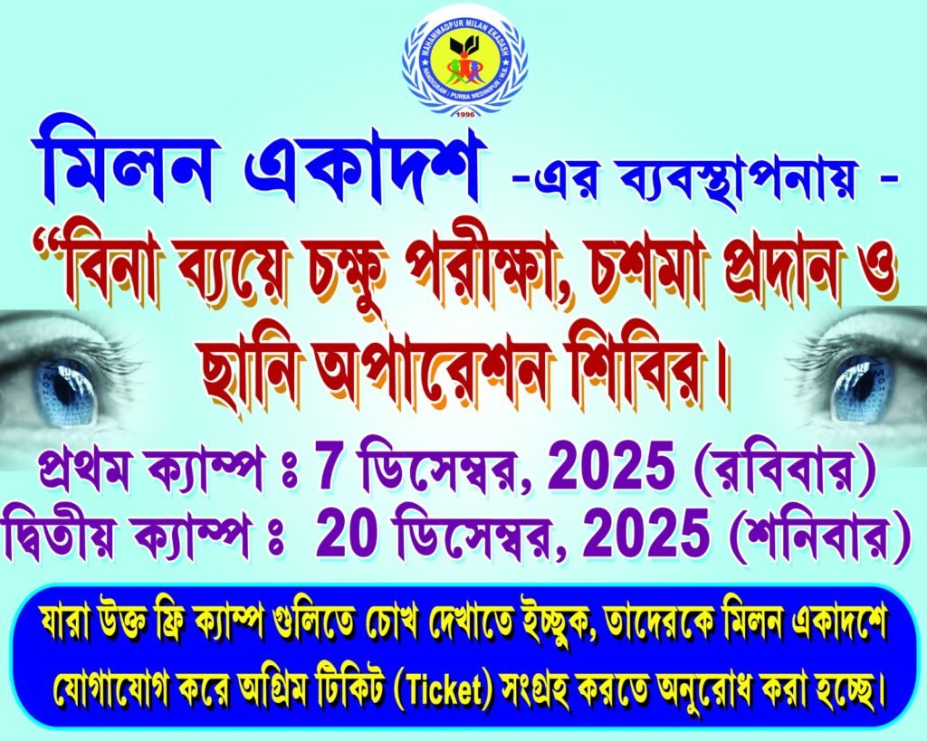 মিলন একাদশ-এর উদ্যোগে অনুষ্ঠিত হতে যাচ্ছে বিনা ব্যয়ে চক্ষু পরীক্ষা, চশমা প্রদান ও ছানি অপারেশন শিবির।